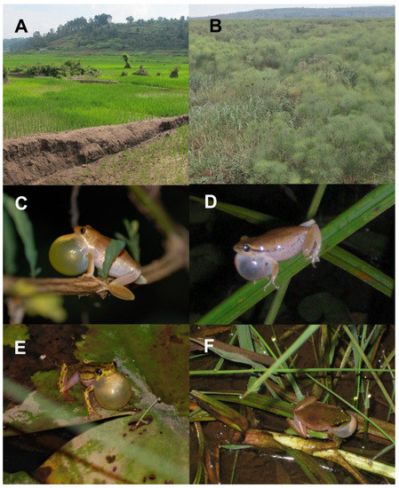 - Tumushimire, L.; Mindje, M.; Sinsch, U.; Dehling, J.M. Anuran diversity of cultivated wetlands in Rwanda: Melting pot of generalists? Salamandra 2020, 56, 99–112. [Google Scholar]