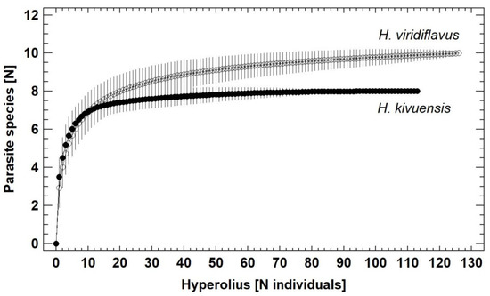 The rarefaction analyses including all sampled localities showed a saturation plateau (six parasite and two endocommensal species) in H. kivuensis after adding 60 individuals, whereas in H. viridiflavus a saturation plateau was not reached after adding all 129 individuals (Figure 3). The jackknife estimate of the actual total number of parasite and endocommensal species comprising the community was 8.9 ± 0.2 (mean and corresponding 95% confidence interval) in H. kivuensis, and 11.0 ± 0.2 in H. viridiflavus, suggesting the presence of one overlooked species.