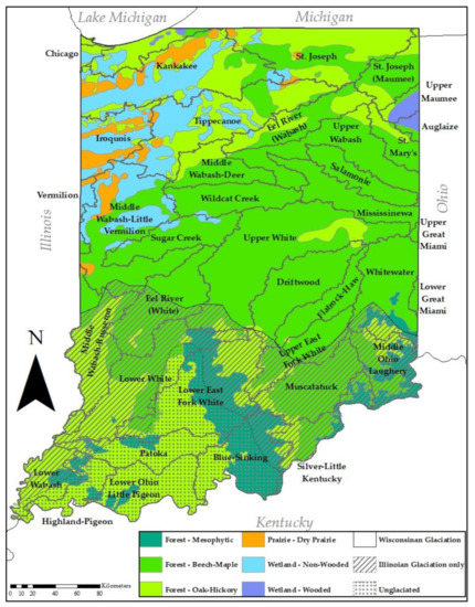 - Homoya, M.A.; Abrell, D.B.; Aldrich, J.R.; Post, T.W. The Natural Regions of Indiana. Proc. Indiana Acad. Sci. 1985, 94, 245–268. [Google Scholar]