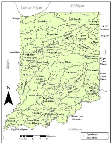 Specimen data (locality labels, determination labels, and catalog numbers) were captured and normalized in a custom database. Most specimens were associated with their database record using a paper catalog number [34]. We georeferenced locations using an online mapping program [35] employing datum WGS-84. Where collectors provided coordinates, these were projected to verify the location and coordinates corrected accordingly. Precision of coordinates are provided as radius in meters: collector-provided = 10 m, localities with stream name and road crossing or small town name = 100–1000 m radius, localities with moderate population size to 50,000 people = 10,000 m, and Indiana county-level records = 100,000 m. State-level records were not mapped. County records were retained in analyses if drainage affiliation was certain.