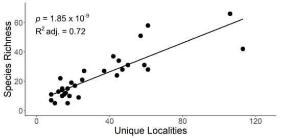 Scatterplot of stonefly species richness versus the unique localities within HUC8 watersheds of Indiana. Adjusted R2, probability, and line of best fit provided for simple linear regression analysis.
