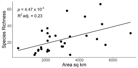 Scatterplot of stonefly species richness versus Indiana HUC8 watershed drainage area in km2. Adjusted R2, probability, and line of best fit provided for simple linear regression analysis.
