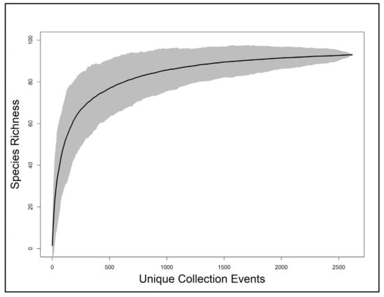 Linear regression indicated a significant, positive relationship between species richness and the number of unique localities sampled within HUC8 drainages (p = 1.85 × 10−09, adjusted R2 = 0.72) (Figure 3). Species richness demonstrated a significant, positive, but weaker relationship with HUC8 area (p-value: 0.005, adjusted R2 = 0.23) (Figure 4). A species accumulation curve demonstrates that stoneflies were sampled to near completeness (Figure 5). The model estimated a terminal species richness of 95 (±5) species, just two more than observed values.