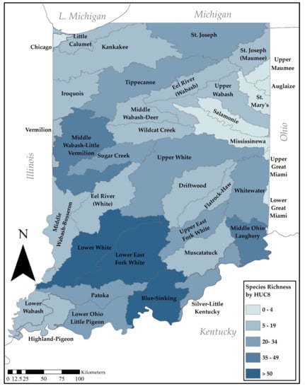 The mean number of species for the 30 HUC8 watersheds with five or more species was 23.3, with a median of 20.0. A heat map of species richness demonstrates that three hyperdiverse HUC8 drainages exist in Indiana (Figure 6, Table S2). These include the Lower East Fork White (66 species), the Blue-Sinking (58 species), and the Lower White (51 species), all in the southern third of the state. Other drainages with richness values above 30 species include the Middle Wabash–Little Vermilion (42 species), the Middle Ohio Laughery (37 species), Silver-L. Kentucky (34), Sugar Creek (31 species), and Upper White (31 species). These too occur in the southern half of the state. Eight watersheds were represented by four or fewer species, all were relatively small in drainage area, inadequately sampled, and unlikely to be diverse.