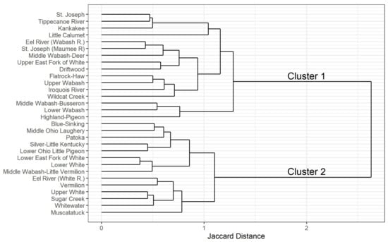 A K-means cluster analysis was used to examine the similarity of species assemblages between different drainages. The number of clusters represented by the data was determined using the “elbow method”, which indicated two clusters in the data. Jaccard distance between HUC8 species assemblages was calculated using vegdist function (vegan R package). This output was then subjected to hierarchical clustering using the hclust function (stats package). These data were plotted as a tree.