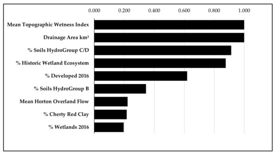 AICc relative importance values (RIV) ranged from 0.196 to 1.000 (Figure 8). Relative positions of the top five variables were (1) mean TWI (1.00), (2) area km2 (1.00), (3) % soils hydrogroup C/D (0.91), (4) % historic wetland vegetation (0.88), and (5) % developed 2016 (0.62).