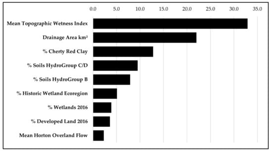 Relative positions of variables shifted when subjected to hierarchical partitioning. The relative positions of the top five highest scoring variables were (1) mean TWI (32.9%), (2) area km2 (22.0%), (3) % cherty red clay (12.8%), (4) % Soils hydrogroup CD (9.5%), and % Soils hydrogroup B (7.9%) (Figure 9). Percent cherty red clay was not included in any of the top six AIC models but ranked in the top three by hierarchical partitioning. Percent soils hydrogroup B moved above % historic wetland ecoregion. The other three variables in aggregate accounted for less than 10% variation.
