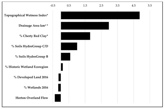 Examining Z-scores indicated that mean TWI, area km2, and % cherty red clay, each explained a significant percentage of variance, with Z-scores over the 95% confidence limit (Figure 10).