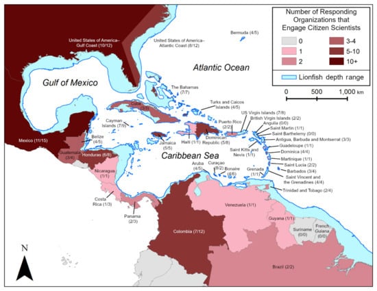 Map showing the lionfish invaded range and information about responding organizations. The number immediately after each location name is the number of organizations that responded to the survey, have worked in that location, and engage citizen scientists. The number after the slash (/) is the number of organizations total that have worked in each location and responded to the survey. Darker colors represent countries with more organizations that engage citizen scientists and lighter colors represent fewer organizations. Gray represents locations with no response. The lionfish depth range is defined as the ~300 m contour throughout the invaded range (North Carolina through Brazil). Lionfish are capable of occupying a range of habitats from 0.5 m to deeper than 300 m [], and lionfish have been detected across the extent of this map as reported to the USGS Nonindigenous Aquatic Species database (https://nas.er.usgs.gov/viewer/omap.aspx?SpeciesID=963, accessed on 1 July 2021).