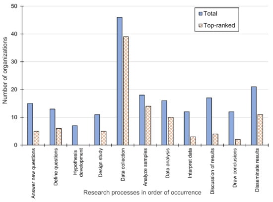 Research-related processes engaged in by members of the public. “Total” indicates if an organization involved members of the public in that process. “Top-ranked” indicates if the respondent from the organization ranked it as “most often” occurring. Each organization’s respondent could place up to two processes in the “top-ranked” category.