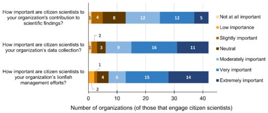 Importance of citizen scientists to research and management (n = 42). Counts for each category of a Likert scale from “Not at all important” to “Extremely important”, in which organization representatives indicated how important citizen scientists are to contributing to scientific findings, data collection, and lionfish management efforts.