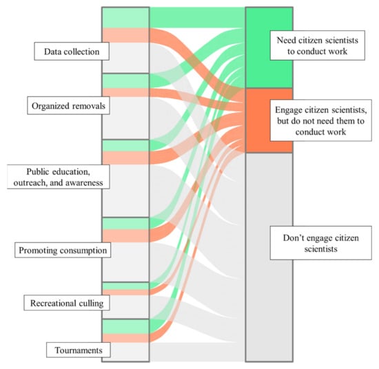 Citizen scientists provide significant contributions to lionfish research and management efforts across a broad spectrum of approaches, research processes, and types of organizations throughout the invaded range of the Western Atlantic. The majority of organizations that engage citizen scientists state that they could not do their work without them. In addition, most organizations engage the public in lionfish removals, which likely helps to mitigate the ecological impacts of lionfish [,]. Our findings show that not just members of the public, but citizen scientists specifically are engaged in every management approach. In other words, engagement of the public in lionfish control as well as involvement of citizen scientists in lionfish research play major roles in monitoring and managing the invasion.