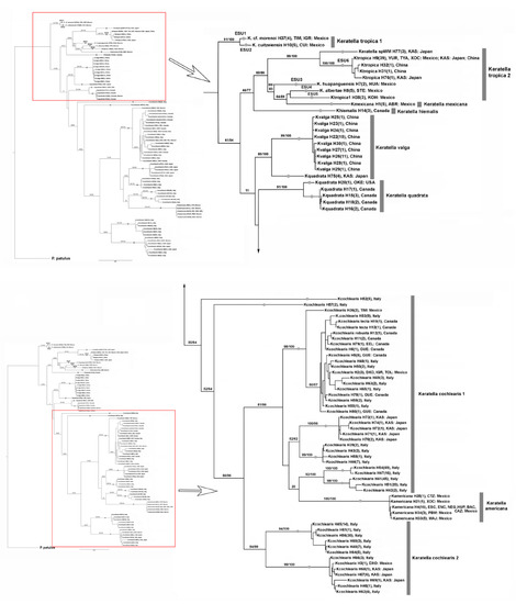 - Stamatakis, A.; Hoover, P.; Rougemont, J. A rapid bootstrap algorithm for the RAxML web servers. Syst. Biol. 2008, 57, 758–771. [Google Scholar] [CrossRef] [PubMed]
