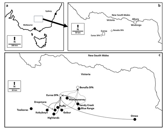 Location of (a) study sites in south-eastern Australia, (b) the two SPAs sampled and (c) source populations for each of the SPAs.