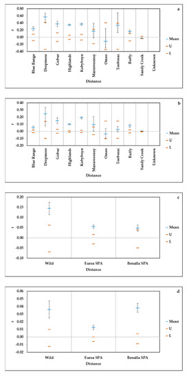 Mean relatedness (r) estimates based on pairwise comparisons for Banksia marginata using Lynch and Milligan (1994) for (a) remnants and for (c) wild and SPAs; Queller and Goodnight (1989) for (b) remnants and for (d) wild and SPAs. Mean values are the mean level of relatedness within the population. U and L are the 95% confidence intervals around the null hypothesis of ‘No difference’ across the populations. Black lines with error bars are the observed mean relatedness and standard deviation for each group.