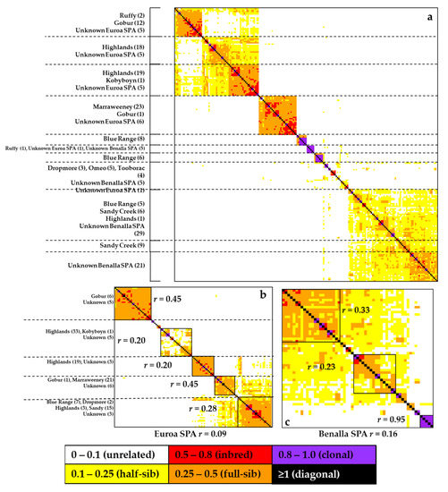 Genomic relationship matrix (G) giving pairwise relatedness (r = 2θ) estimates based on pairwise comparisons using the Wang (2007) estimator for (a) all trees, (b) Euroa SPA only and (c) Benalla SPA only. The diagonal shows the relatedness of an individual to itself (1 + f, where f is Wright’s inbreeding coefficient). Colors other than white indicate close relatedness, with colors darker than orange showing relationships closer than half-sib (half-sibs, full-sibs, parent-offspring). A small number of individuals from Blue Range and Ruffy appear to be clonal or replications of the same tree.