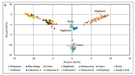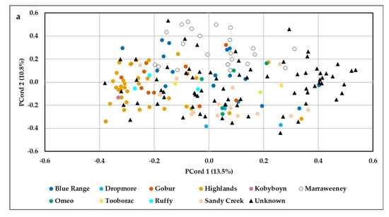 Principal coordinates analysis results for all Banksia marginata trees based on (a) SSR and (b) SNP datasets.