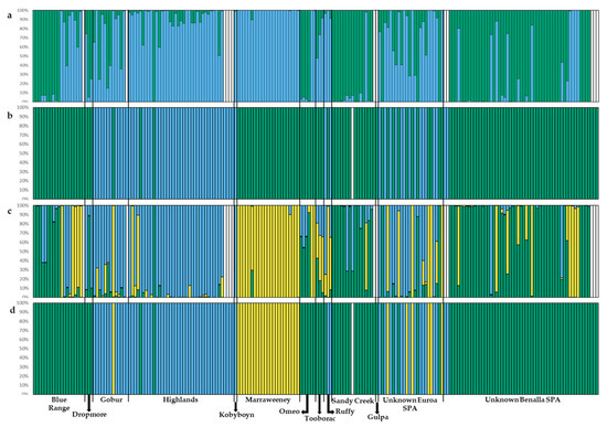 STRUCTURE analyses for Banksia marginata remnant and SPA trees; each bar represents a single tree. K = 2 for (a) SSRs and (b) SNP. K = 3 for (c) SSRs and (d) SNPs. Green is Cluster 1, blue is Cluster 2, yellow is Cluster 3 and white bars indicate failed reactions.