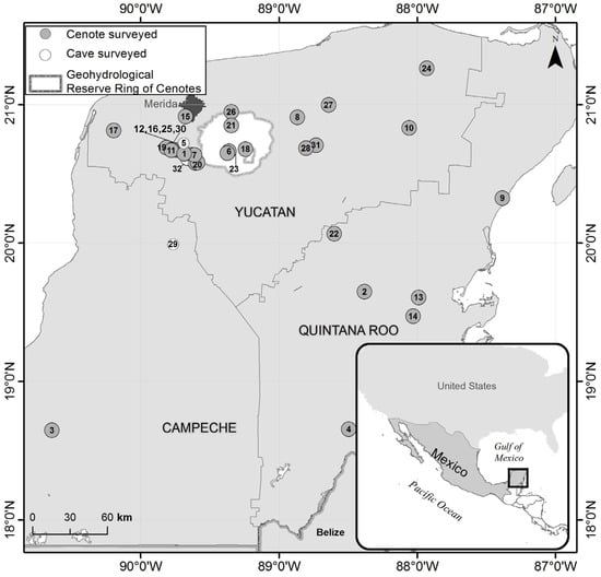 Map of the Mexican federal states of the Yucatán Peninsula and location of the 32 studied caves and cenotes. Details of the numbered cenotes can be found in Table S1. The light area within the Yucatán state represents the Geohydrological Reserve in Yucatán, while the dark area depicts the urban extension of the city of Merida.