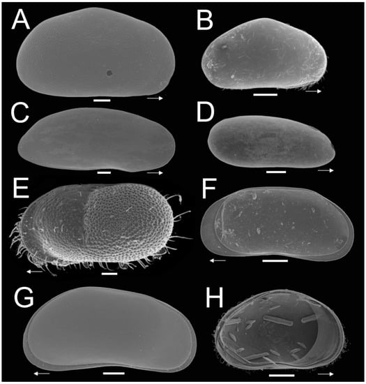 - Meisch, C. Freshwater Ostracoda of Western and Central Europe; Süsswasserfauna von Mitteleuropa 8/3; Spektrum Akademischer Verlag: Heidelberg/Berlin, Germany, 2000; pp. 1–522. [Google Scholar]