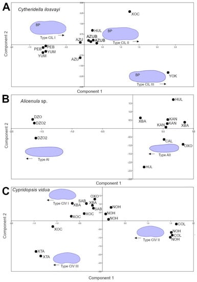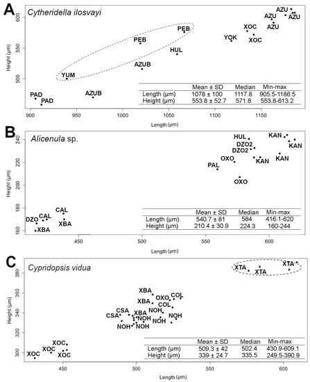 The scatterplots for Alicenula sp. and C. vidua showed well-differentiated positions between populations. For Alicenula sp. two groups were identified, differing in size. Populations of Calcuch, X‘batun and Dzonbacal were short specimens (<450 µm length and 180 µm height), whereas all other populations were consistently larger with sizes > 550 µm length and 200 µm height. Length, height and L/H ratio of Alicenula sp. differed significantly between populations (Kruskal–Wallis test, length: H2 = 16.36, height: H2 = 15.25, L/H: H2 = 13.27; all n = 19, p-value < 0.05; Figure 5B).