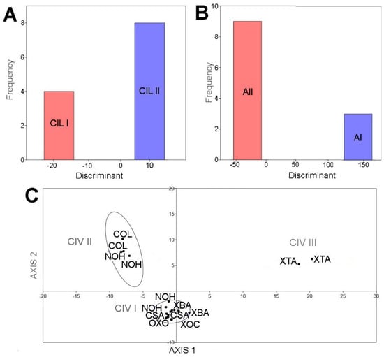 The principal component analysis based on the first and second components of elliptic Fourier coefficients, explain more than 59% of total data variation for C. ilosvayi (Figure 3A), Alicenula sp. (Figure 3B), and C. vidua (Figure 3C). For C. ilosvayi, the first and second principal components of the PCA explained 85% of total data variation. Patterns in morphospace suggested the presence of three morphological forms that seem not to be randomly distributed but, rather, associated with habitat types (Figure 3A). Cave systems Yumku and Peba were associated with the first morphotype (type CIL I), in which the outline describes elongated organisms with a well-developed brood pouch, exceeding the dorsal margin, and with the anterior margin slightly pointed. The second morphotype (type CIL II; Figure 3A) is related to cenotes, with the water surface directly in contact with the exterior. These organisms are narrow, elongated, and square—shaped, with an almost straight dorsal margin (without overlapping of the brood pouch) and a broadly rounded anterior margin. The third morphotype (type CIL III; Figure 3A) is considered a valve deformation, as it was observed in a single specimen. It was characterized by a narrowly developed and totally compressed brood pouch area. This specimen belongs to cenote Yokdzonot and contrasted markedly with the other forms. Due to the low number of specimens recovered, we cannot provide a reliable conclusion on the nature of this form. A MANOVA test showed significant differences (Wilks’ lambda test: ΛWilks = 0.0014, F = 151.7, p < 0.006) between CIL I and CIL II morphotypes. Jackknifed rate classification was 83% correctly assigned for this species. Positions of CIL I and CIL II morphotypes on the CVA plot were clearly differentiated and no overlap was observed (Figure 4A).