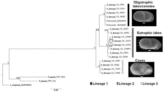 The following are available online at https://www.mdpi.com/1424-2818/13/2/44/s1, Table S1: Location data of the studied cenotes and caves, Table S2: GenBank identification codes and accession numbers for COI and 18S rDNA sequences of Cytheridella ilosvayi populations, Figure S1: Phylogenetic tree of concatenated COI-18S dataset on Cytheridella ilosvayi populations of cenotes, caves and lakes in the Yucatán Peninsula. COI tree topology based on Bayesian Inference (BI); numbers below branches represent Bayesian posterior probabilities; abbreviations on tree topology correspond to GenBank species identification codes (see Table S2).