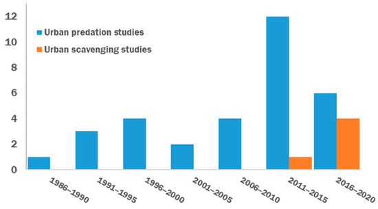 Temporal comparison between urban predation and urban scavenging published studies, based on the total of articles retained strictly from the systematic review, conducted with closed search.