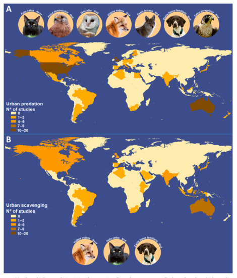 Number of urban predation (A) and scavenging (B) studies per country. Darker colors show high number of articles found for a given country, ranging from 0 to 20. The circles represent the species most reported in the articles (appearing on 5 or more occasions), ordered from most-reported to least-reported, from the top left corner. Pictures by: Manfredrichter, Ruthmcd, Miles, Wilda3, Skeeze and Ebor.