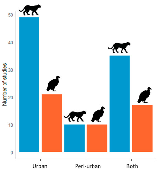 Number of studies conducted in urban and/or peri-urban areas on predation (blue bars) and scavenging (orange bars).