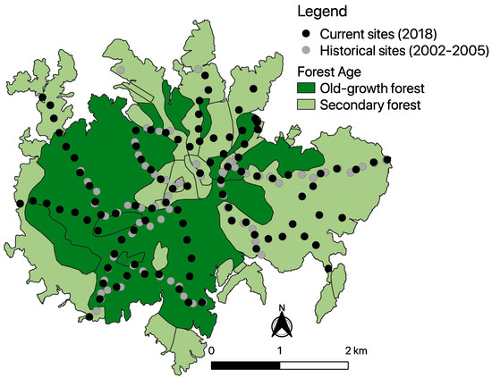 Map of Barro Colorado Island and distribution of forests of different ages (adaptation from [31]). The grey circles represent the historical sampling sites (2002–2005), and the black circles represent the most recent sampling sites (2018).