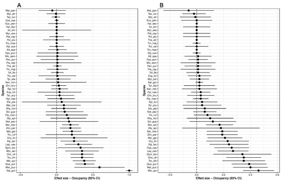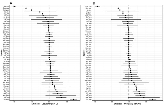 In contrast, 14 species showed a decrease in occupancy point estimates (Table S5). Two species had a significant and negative effect of Era on occupancy on both old-growth (Figure 3A) and secondary forest (Figure 3B): Cyanoloxia cyanoides (1.0–0.16), an understory omnivore, and Melanerpes pucherani (0.59–0.11), an omnivorous woodpecker species. Whereas one species Saltator grossus (1.0–0.02) had a significant and negative effect of Era only on old-growth forest (Figure 3A). Four other species also showed a substantial decrease in occupancy between 2002–2005 and 2018 (change in occupancy > 0.10), although with imprecise estimates of Era’s effect. Despite the large occupancy decline detected for Cyanoloxia cyanoides and Saltator grossus, these species occurred in few sites in the historical period (n = 7 and n = 3) and were never detected in the same site twice in the historical period. Low occupancy associated with low detectability can often lead to occupancy probabilities close to one with no reliable uncertainty measures [36]; therefore, we interpret the change in occupancy by Cyanoloxia and Saltator with caution. Among the species with no significant change in occupancy (n = 43), 24% (n = 5) were relatively rare (ψ < 0.30) in the old-growth forest, and (n = 10) were rare in the secondary forest, occurring only in a few sites on the island. In contrast, 24 species are very common and widespread in the old-growth forest (ψ > 0.70), and 17 species are very common and widespread in the secondary forest (Table S5).