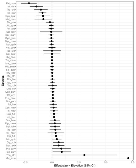 Only three of the 15 birds associated with old-growth forest sites had significant occupancy changes between historical and current periods (Melanerpes pucherani, Cyanoloxia cyanoides, and Saltator grossus), in which the occupancy declined in all three species. Another 17 species also showed a substantial higher occupancy in old-growth forest sites in the current period (occupancy change > 0.10), although with imprecise estimates of the effect of forest age. Elevation had no significant impact on the occupancy of the majority of bird species (Figure 5). Nevertheless, five bird species (Glyphorynchus spirurus, Microrhopias quixensis, Myrmotherula axillaris, Poliocrania esxul, and Penelope purpurascens) showed a positive relationship between elevation and occupancy. Another five species showed a negative relationship between elevation and occupancy (Patagioenas cayennensis, Icterus chrysater, Trogon chionurus, Cyanoloxia cyanoides, Tyrannulus elatus). Among the species with a significant elevation effect on occupancy, only Cyanoloxia cyanoides showed a decline in occupancy between periods.
