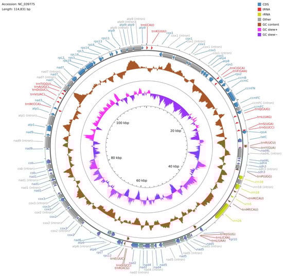 Polytrichum commune mitogenome (Figure 1) consists of a single circular molecule; its length is 114,831 bp, which exceeds the length of most published bryophyte mitochondrial genomes in the GenBank database, with the exception of Sphagnum palustre L. NC024521 (141,276 bp), Andreaea wangiana P.C. Chen NC046759, (117,857 bp), and Atrichum angustatum NC024520 (115,146 bp). The size of mitogenome of Pogonatum inflexum (Lindb.) Sande Lac., which is one of three Polytrichopsida representatives involved in the analysis, is slightly smaller and equal to 113,866 bp, while the mitogenome length of all the other mosses is less than 110 Kb and varies from 109,586 bp (Funaria hygrometrica Hedw.) to 100,342 bp (Mielichhoferia elongata (Hoppe & Hornsch.) Nees & Hornsch.).