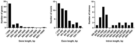 The length of genes, exones, and introns in the mitochondrial genome of P. commune is presented in Figure 2. The shortest genes are trnG (UCC), trnC (GCA), and trnQ (UUG), with a length of (71 bp). The first two genes trnC (GCA) and trnG (UCC) have the same length in all other 43 mitogenomes under investigation. At the same time, due to a discrepancy in annotation of the trnQ (UUG) gene its length (and orientation in Oxystegus tenuirostris) differs among Bryophyta mitogenomes: 68 bp in Pogonatum inflexum, 71 bp in Andreaea wangiana, Atrichum angustatum, Bartramia pomiformis Hedw. Buxbaumia aphylla Hedw., Funaria hygrometrica, Mielichhoferia elongata, and Sphagnum palustre, and 72 bp in all other analyzed mosses (Table S1). In all mitogenomes under consideration, the cox1 gene is the largest; the maximum length among them is 14,934 bp in Sphagnum palustre, and 9450 bp in P. commune. In other mosses, its length varies from 7081 bp in Tetraplodon fuegianus Besch. to 9443 bp in Pogonatum inflexum. Among exons, exon 3 of the atp9 gene (8 bp) and exon 2 of the nad2 gene (1314 bp) have boundary values in length distribution. Intron length varies from 480 bp (intron 3 of the cox1 gene) up to 2649 bp (intron 3 of the nad5 gene).