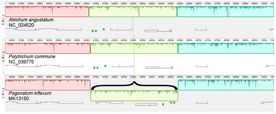 Structural alignment of Polytrichopsida representatives using Mauve plugin. The locally collinear blocks (LCBs) are colored and represented syntenic regions. The green block marked by a curly brace within Pogonatum inflexum mitogenome represents inversion.