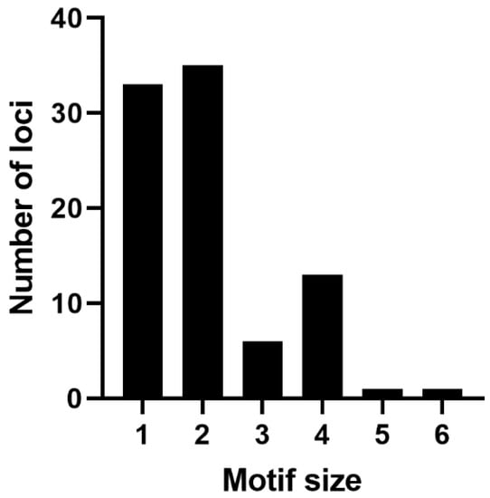 In total, 89 microsatellite loci (SSR) were found in the mitogenome of P. commune (Table S2) under the following identification criteria: minimal number of repeating units ≥10 for mononucleotides, ≥5 for dinucleotides, ≥4 for trinucleotides, and ≥3 for tetra-, penta-, and hexa-nucleotides. Of these, 13 are located in coding sequences, and 76 in noncoding sequences. The SSR length distribution is shown in Figure 4.