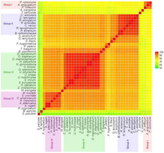 Heatmap of bryophyte whole mitogenome pairwise identity. The color key on the figure shows the percentage of pairwise identity between mitogenomes. Groups formed by species with a high pairwise identity are indicated.