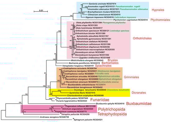 Due to the high level of conservation of bryophyte mitogenomes, it is possible to construct a reliable multiple alignment not only for CDS but for complete genome sequences. When analyzing pairwise identity of whole mitogenome sequences on a heatmap, four groups are well distinguished (Figure 5). The first one consists of P. commune, A. angustatum, and P. inflexum from Polytrichopsida (intragroup identity varies from 92.85% to 97.90%). The second group is composed of Grimmiales species (intragroup identity varies from 97.62% to 99.56%). The third group is formed by members of the Orthotrichales order (intragroup identity ranges from 96.22% to 99.98%), and the fourth group includes representatives of Hypnales (intragroup identity ranges from 95.66% to 99.87%). All groups are presented as maximally supported clades on the phylogenetic tree (Figure 6). All Bryopsida representatives are combined in a large group with a minimal pairwise identity of 79.19%. Thus, clustering of bryophytes taxa on pairwise identity of the whole genomes corresponds to phylogenetic reconstruction only from coding sequences but with the two exceptions explained in detail below.