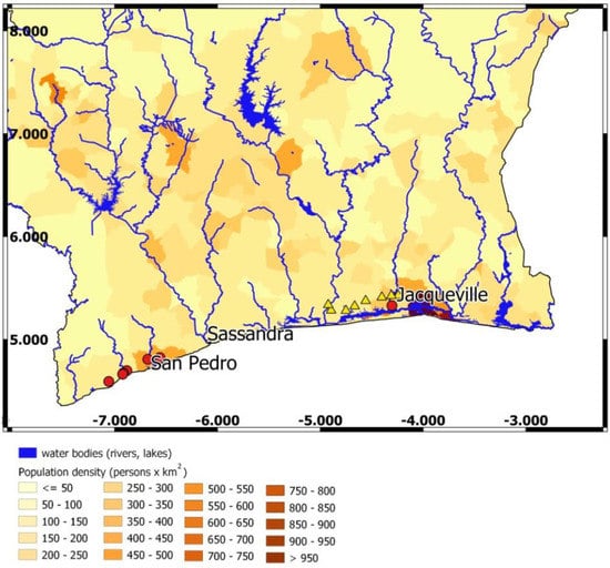 Map of the southern Ivory Coast showing the localities of the capture of sympatric turtles (red dots) and of allopatric Pelusios castaneus (yellow triangles), the water bodies, and the human population density.