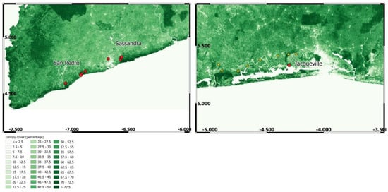 We studied turtles in 18 different localities along the coastal region in the Southwestern Ivory Coast, West Africa (Figure 1). These sites represented a random selection of potential aquatic habitats in the Southwestern Ivory Coast, though sites were chosen due to ease of access. The landscape was forest adjacent to the sea, crossed by vegetated hills, and intersected by valleys of different widths (Figure 2). The region is characterized by a subequatorial climate of two rainy seasons, influenced by the Intertropical Front (ITF) that extends from East to West. This zone has the highest rainfall in the country, with an average annual rainfall >1800 mm. However, the coastal area between Sassandra and Jacqueville receives less rainfall (between 1600 and 1800 mm). The human population density along the entire coastal area is relatively high, mostly in urban environments. Economic activity is dominated by agriculture, fisheries, and mineral extraction. Other uncontrolled activities provoke further pressure on the environment of this area. These activities include clearing of coastal vegetation, expansion of makeshift buildings to accommodate the increasing human population, as well as emerging tourism, removal of sand, and dam building on rivers for agriculture or energy production.