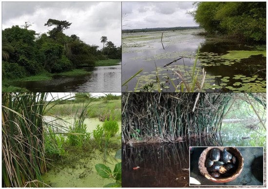 - Akani, G.C.; Eniang, E.A.; Amadi, N.; Dendi, D.; Hema, E.M.; Diagne, T.; Ségniagbeto, G.H.; Di Vittorio, M.; Gbewaa, S.B.; Pawels, O.S.G.; et al. Macrohabitat and microhabitat usage by two softshell turtles (Trionyx triunguis and Cyclanorbis senegalensis) in West and Central Africa. Herp. Cons. Biol. 2018, 13, 642–651. [Google Scholar]
