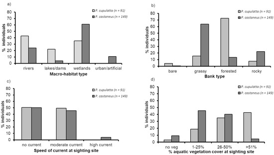 At a macro-habitat scale, P. castaneus was captured mainly in marshlands, whereas P. cupulatta was found in both rivers and wetlands. The two species differed significantly in their use of: (i) banks (P. castaneus being found mainly in spots with grassy banks and P. cupulatta in tracts of the waterbodies characterized by forested banks), and (ii) aquatic vegetation (P. cupulatta preferred spots with more abundant aquatic vegetation than P. castaneus), but both species selected sites with no or moderate current. Overall, the microhabitat preferences (bank and aquatic vegetation types) were consistent with the general distribution features of the two study species, as P. castaneus is distributed also in open-land waterbodies [4,18] whereas the same is not true for P. cupulatta [18]. However, because our data were collected over a short time period, we did not incorporate potential effects of seasonality that could have influenced habitat usage and location characteristics. During the dry season, for example, patches of land that are otherwise inundated are often dry and may become unsuitable for aquatic turtles. In this case, Pelomedusid turtles normally remain inactive in congealed mud, in shady and covered sites. Seasonal variations in habitat use have already been observed in West African aquatic reptiles [27] and, thus, could not be excluded in the case of turtles, especially in those marshlands and flooded banana plantation sites where water is available almost exclusively during the wet season.