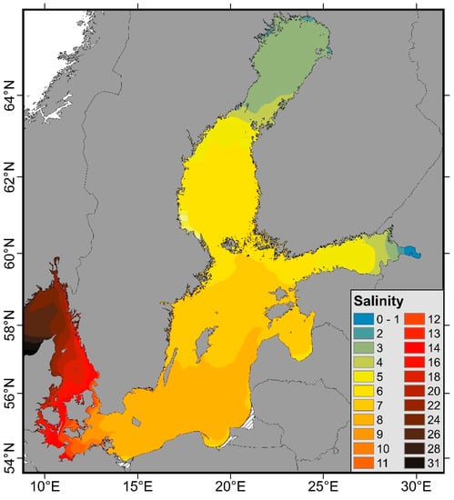 Five-year average (2015–2019) of the sea surface salinity (1.5 m) indicating the extended salinity gradient of the Baltic Sea, obtained from hydrodynamic modelling (data from Lehmann et al. [18]).