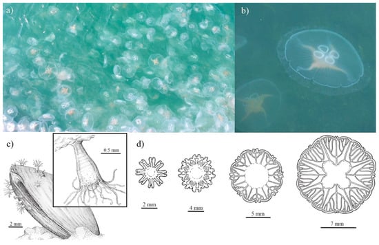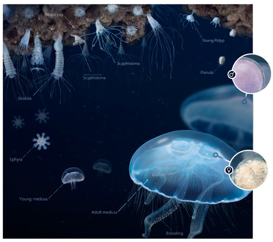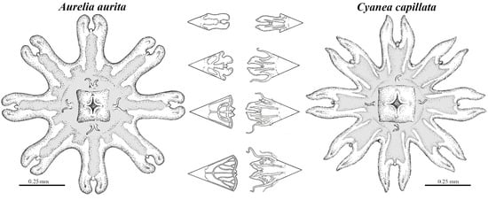 - Holst, S. Morphology and development of benthic and pelagic life stages of North Sea jellyfish (Scyphozoa, Cnidaria) with special emphasis on the identification of ephyra stages. Mar. Biol. 2012, 159, 2707–2722. [Google Scholar] [CrossRef]