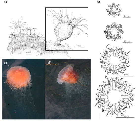 The Lion’s mane jellyfish Cyanea capillata (a) with polyp colony and close up of an individual polyp (inlet), (b) development sequence of ephyra, (c,d) medusae (ca. 35 cm) in Kiel Fjord, Sept. 2014. Image credit (a,b): N. Bezio, (c,d): C. Jaspers.