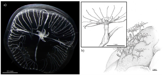 Medusae have a hemispherical bell with max 22 mm in diameter with a thick mesoglea and are typically colorless—apart from the whitish gonads, which are visible as crosses over the four radial canals (Figure 6). Gonads are thin and extend two-thirds the length of the radial canals Medusa contains a thin vellum with a maximum opening roughly three-quarters the diameter of bell margin. The number of tentacles varies and is dependent on development stage, but margin contains roughly 50–142 filiform tentacles. Specific diagnostic characteristics include endodermal cores of tentacles, which can project into the bell with a simple finger-shaped projection that points into the mesoglea. Additionally, between adjacent tentacles, closed lithocysts with 1–3 concretions with grey pigmentation at their base can be seen, even though this characteristic is not diagnostic for all B. virginica sub-populations (can best be observed in white field light mode of stereomicroscope inspection of life material [15]). Manubrium is large and round to square in shape while in cross section, typically two-thirds the height of the bell, opaque white in color, and tipped with four crenulated curved lips [15,73,78,80].