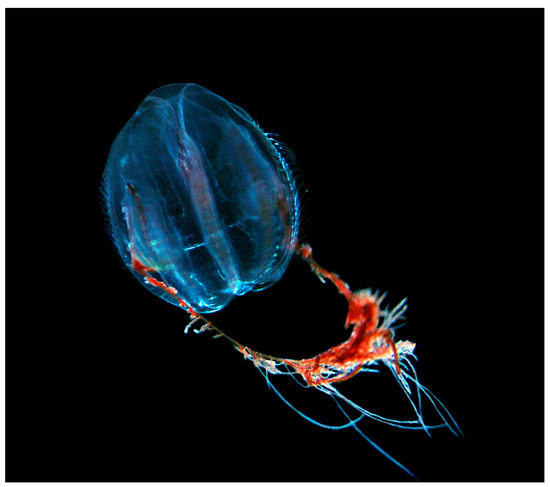 The comb jelly Mertensia ovum (Figure 8) is an arctic relict species in the Baltic Sea and has lately been confirmed to reach seasonally high abundances—especially during winter [11,12]. So far, this species has been largely overlooked in food web investigations, though laboratory experiments confirm that M. ovum consumes microbial loop components, thereby efficiently channeling energy to higher trophic levels [9]. This pathway might be important for the Baltic Sea ecosystem, especially during winter, when meso-zooplankton abundances are low.