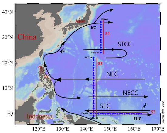 Sampling stations of the 2017 Western Pacific Cruise; the appropriate locations of the different currents are described according to Hu et al. and categorized into S1, S2, and S3 transects based on the shadow environment of the station circulation. Surface currents include the Kuroshio Current (KC), Subtropical Countercurrent (STCC), Northern Equatorial Current (NEC), North Equatorial Countercurrent (NECC), and Equatorial Undercurrent (EUC).