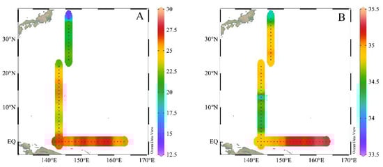 Section 2 (S2) was assigned to the longitude of 143° E, which mainly passes through the ocean circulation, including the North Equatorial Current, the North Equatorial Countercurrent, and the South Equatorial Current (Figure 1). It can be seen from the S2 cross-sectional temperature and salinity profiles that there was an upward current between 3° and 10° N. This also explains why the temperature and salinity of the sea area around 5–10° N in horizontal distribution (Figure 2) are lower than those of the surrounding stations (Figure 3).